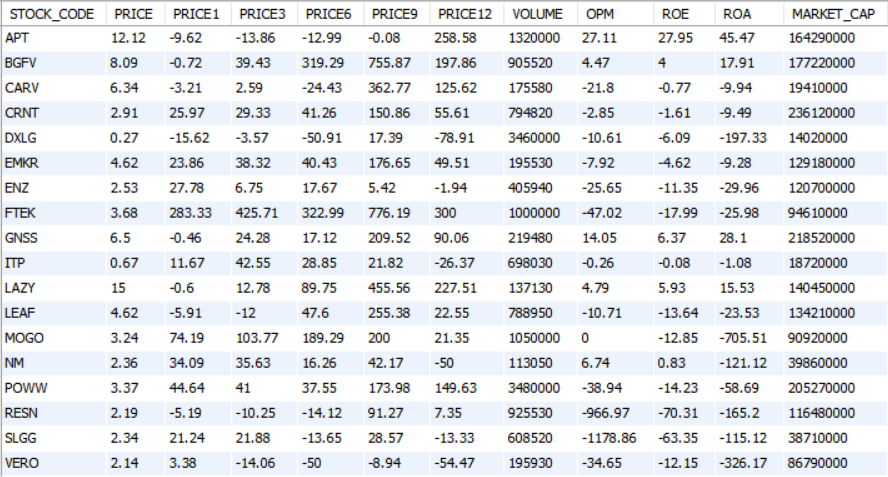 이제 저장된 데이터로 간단하게 종목을 한 번 추출해보도록 하겠습니다. 위 쿼리를 간단히 살펴보겠습니다.